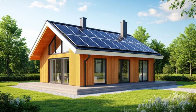 «Привет! Я делаю презентацию для стартапа в стиле эко-технологий. Мне нужно современное, чистое изображение дома. Это должен быть красивый, энергоэффективный дом с большими окнами и солнечными панелями на крыше, в скандинавском стиле, в светлых тонах. Сделай изображение в виде 3D-визуализации, чтобы оно выглядело как профессиональный архитектурный рендер».